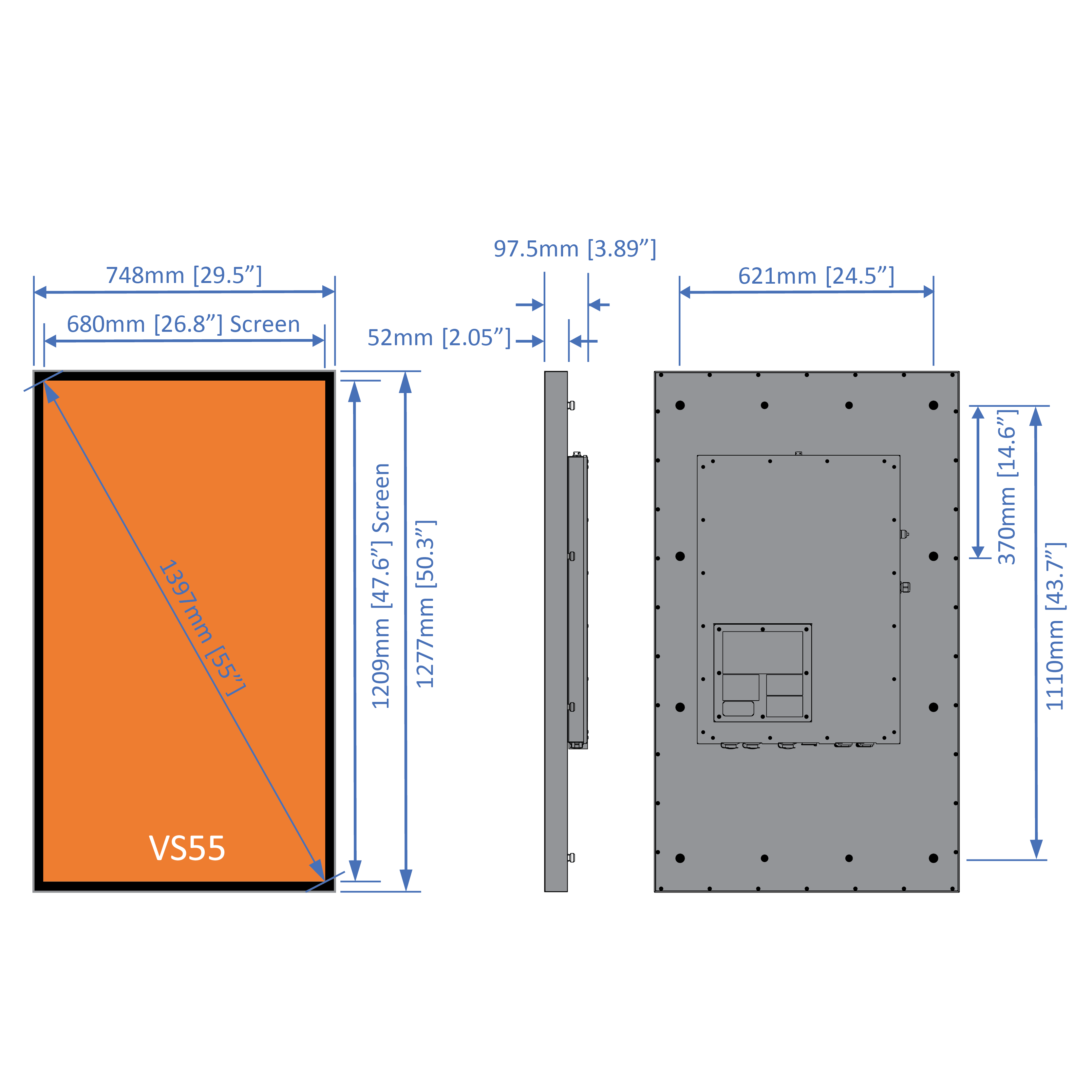 VS series product is designed for semi-outdoor applications that are not subject to direct sunlight, and integrates a 1500nit LCD display with direct LED back-lighting, this single face 55" display could either be attached directly to the wall with a swing frame kit or a floor standing kit. The floor standing kit can be optioned with a double sided display configuration.