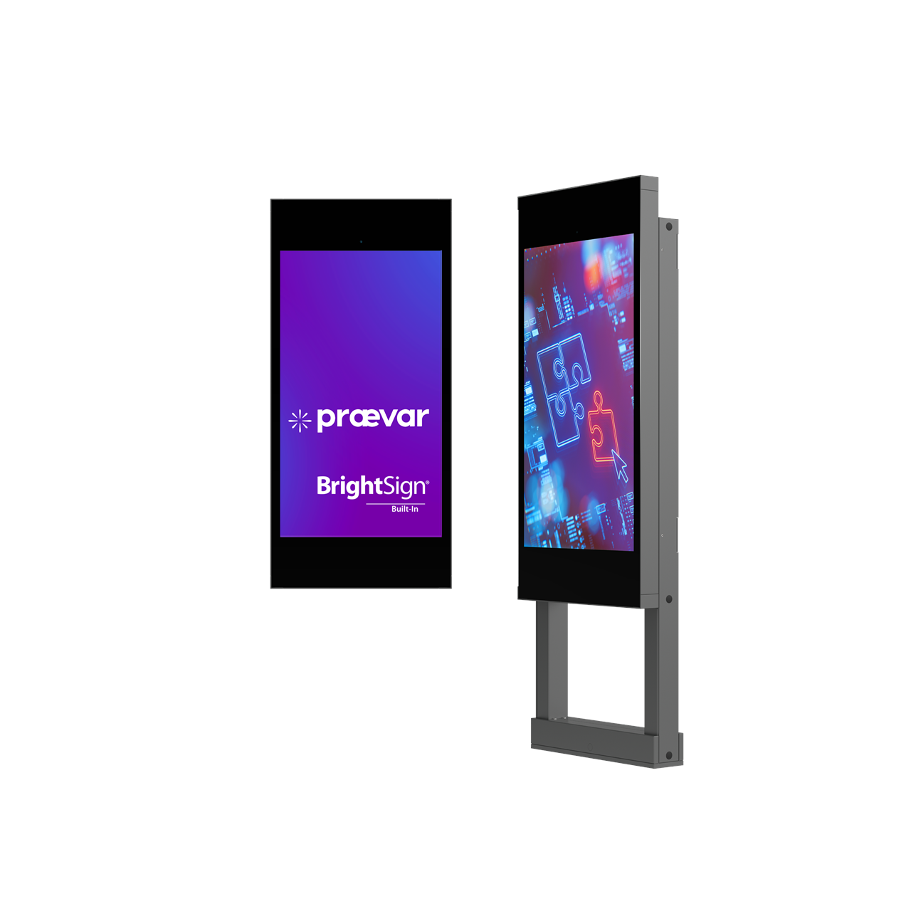 Wall-mounted or free standing 55" landscape or portrait full outdoor digital display.