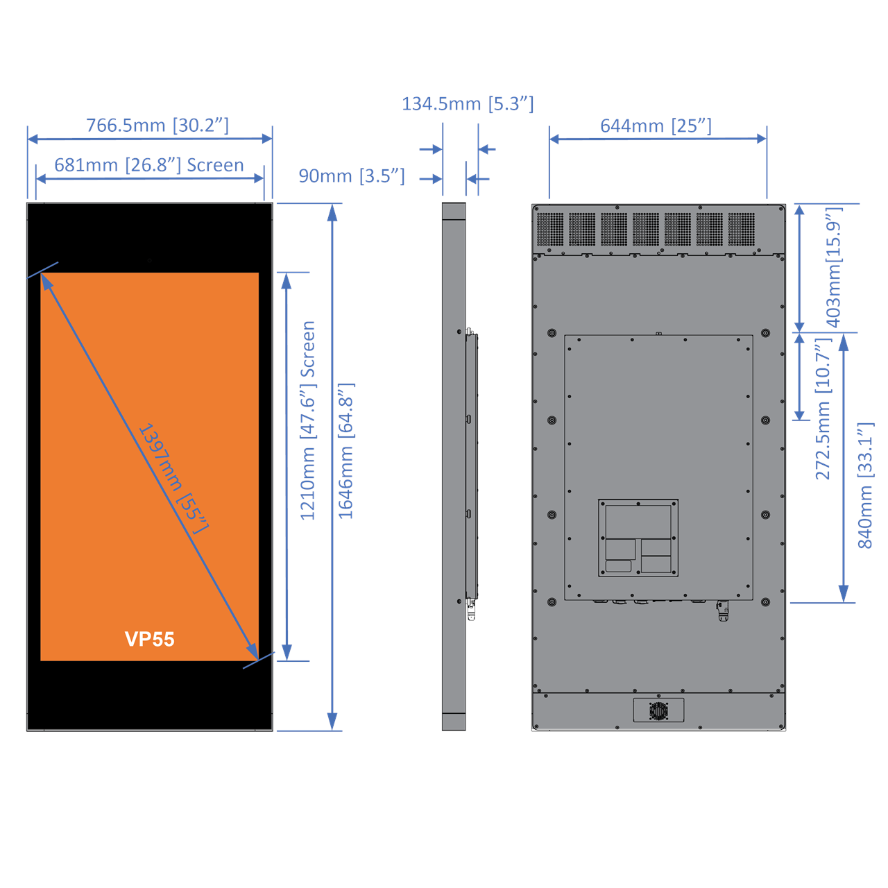 VP series product is designed for full outdoor sunlight readability, and integrates a 2500nit LCD display with direct LED back-lighting, this single face 55" display attaches directly to the wall with a swing frame kit or a floor standing kit. The floor standing kit can be optioned with a double sided, back-to-back display configuration.