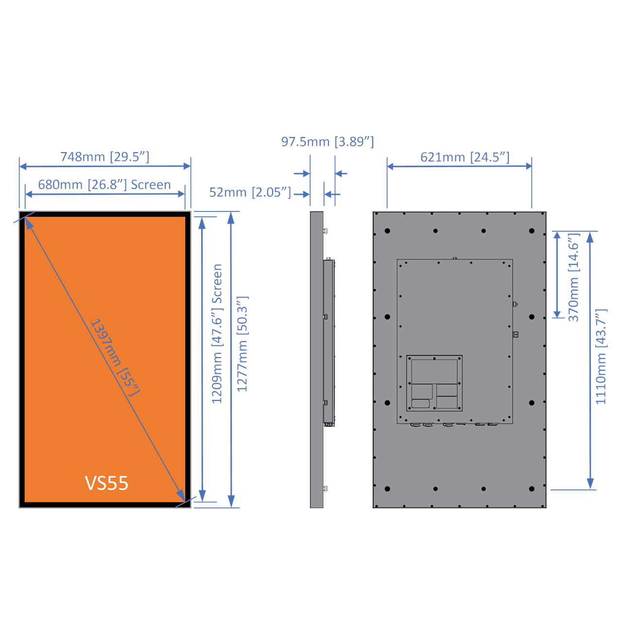 VS series product is designed for semi-outdoor applications that are not subject to direct sunlight, and integrates a 1500nit LCD display with direct LED back-lighting, this single face 55" display could either be attached directly to the wall with a swing frame kit or a floor standing kit. The floor standing kit can be optioned with a double sided display configuration.