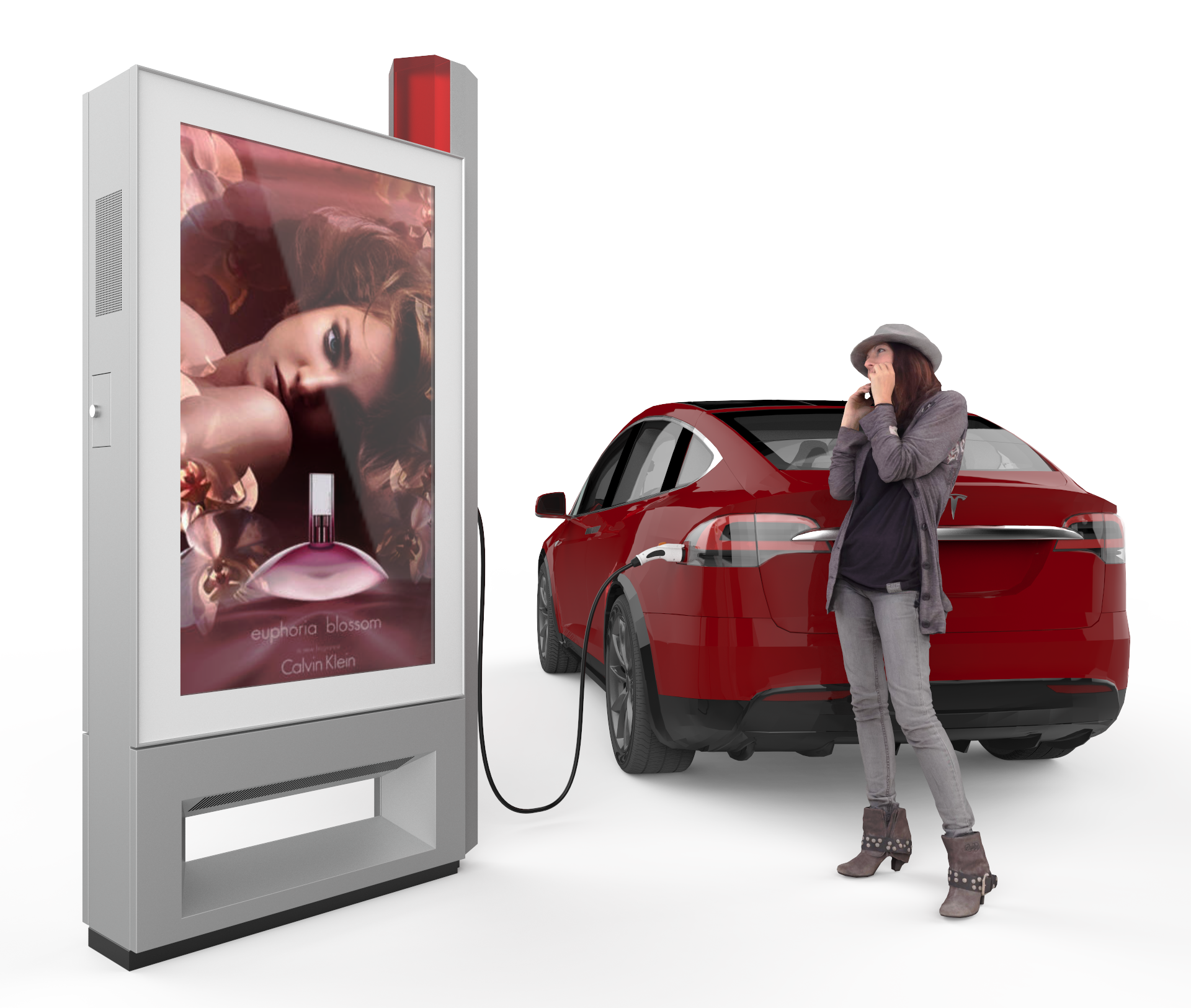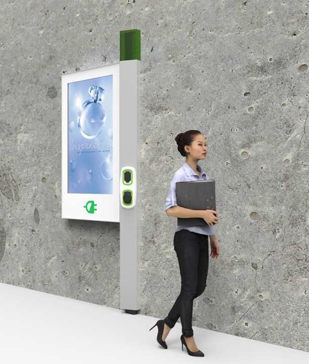 Freestanding Double Sided 55" LCD Display c/w Electric Vehicle charging outlet.