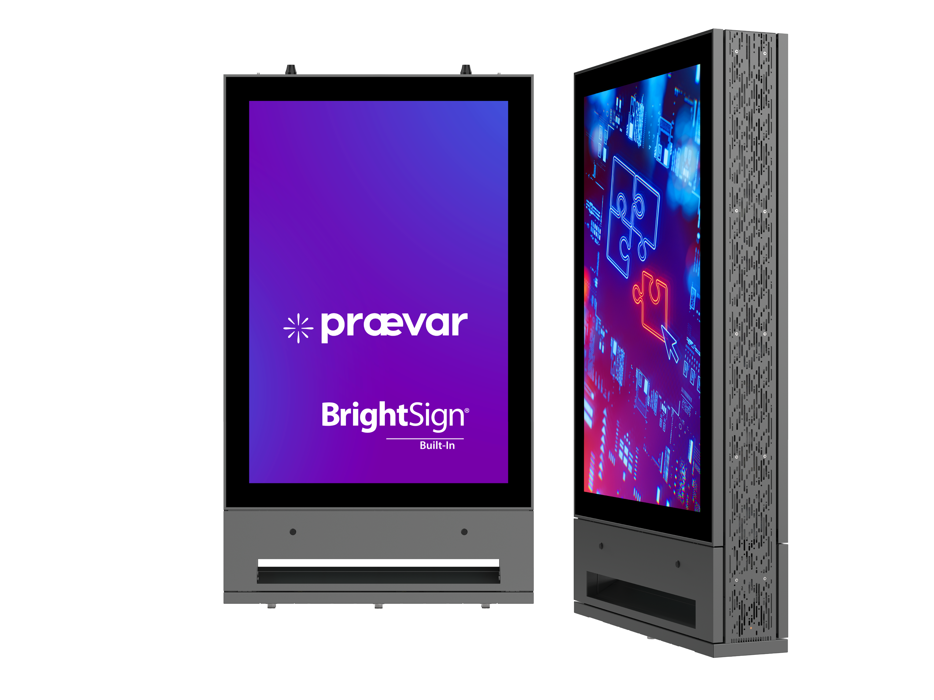 Wall-mounted or free standing 55" landscape or portrait full outdoor digital display.
