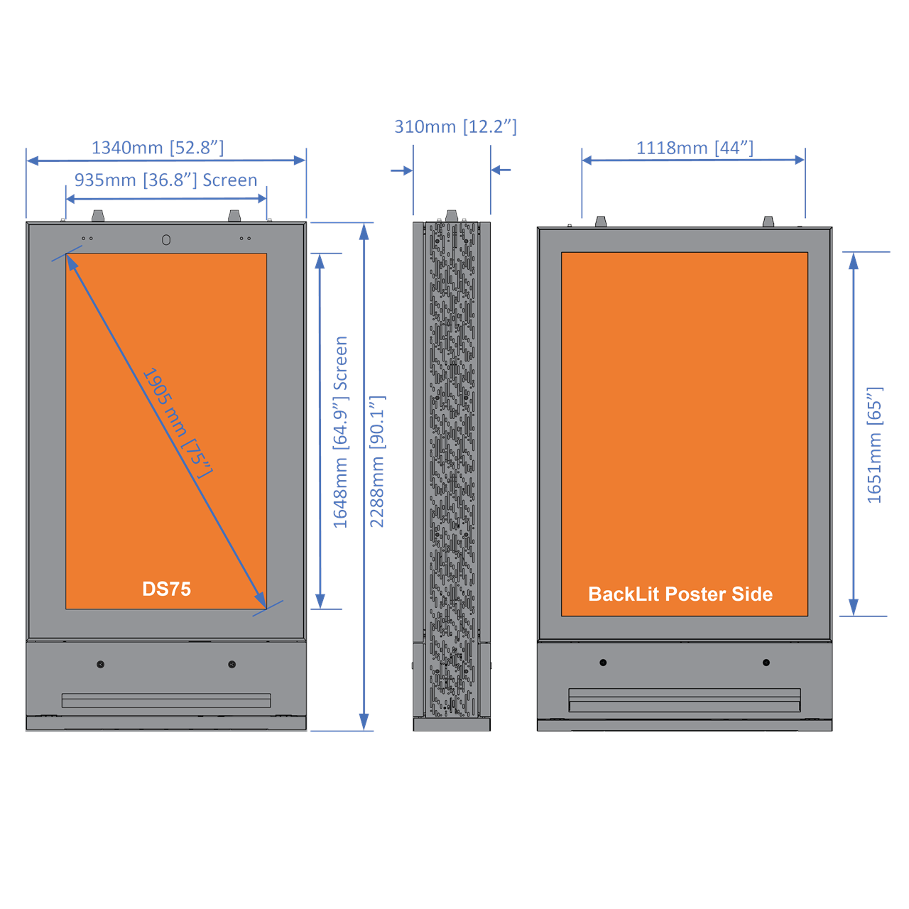 This format of Digital Out-of-Home Display system is designed specifically to replace the international standard 2 sq.m or 6-sheet static poster utilized within street furniture networks across the globe. A 75" diagonal LCD screen used in portrait is dimensionally the closest in height and width within a 16:9 aspect ratio.
