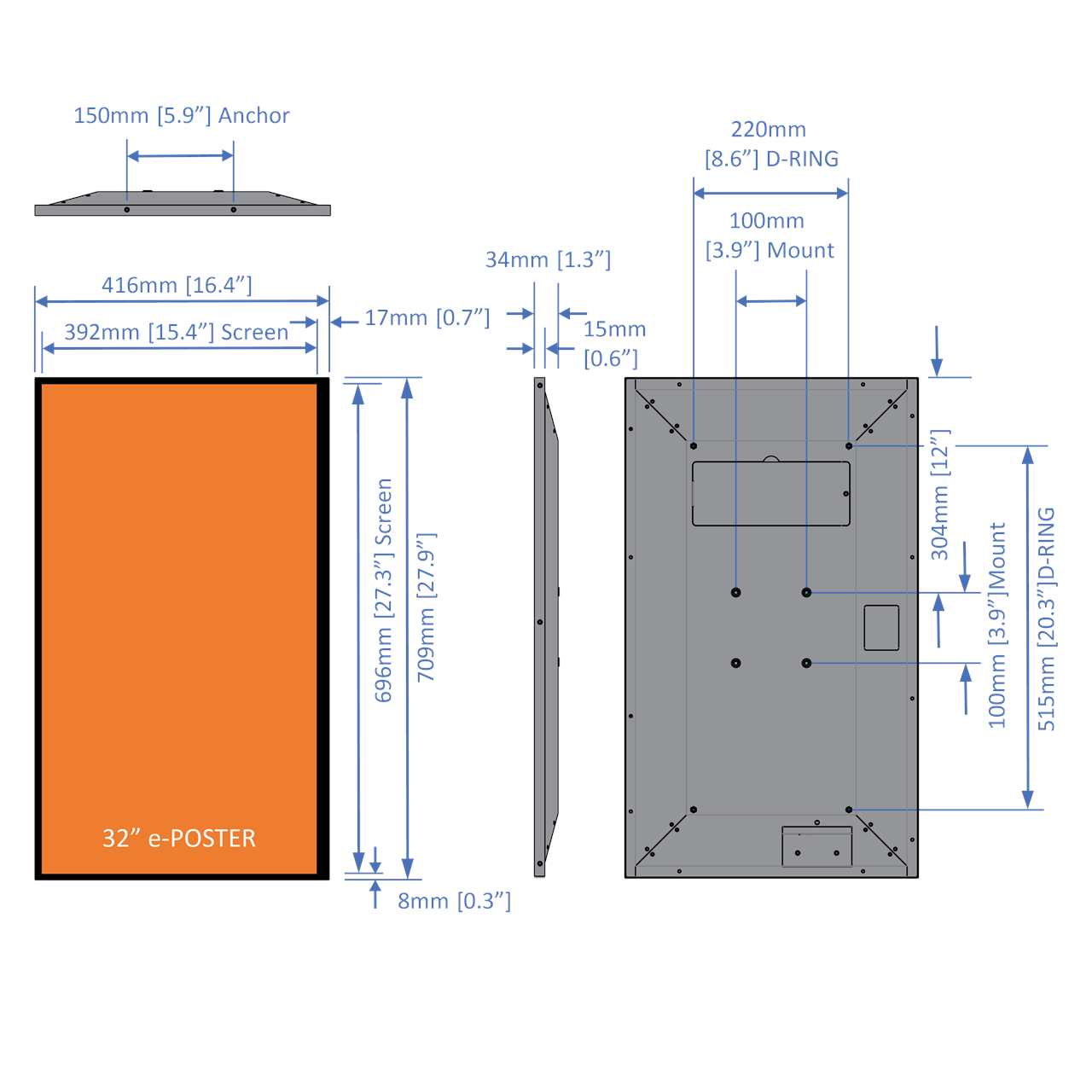 Wall-mounted 32" landscape or portrait 60K colour indoor ePoster digital display.