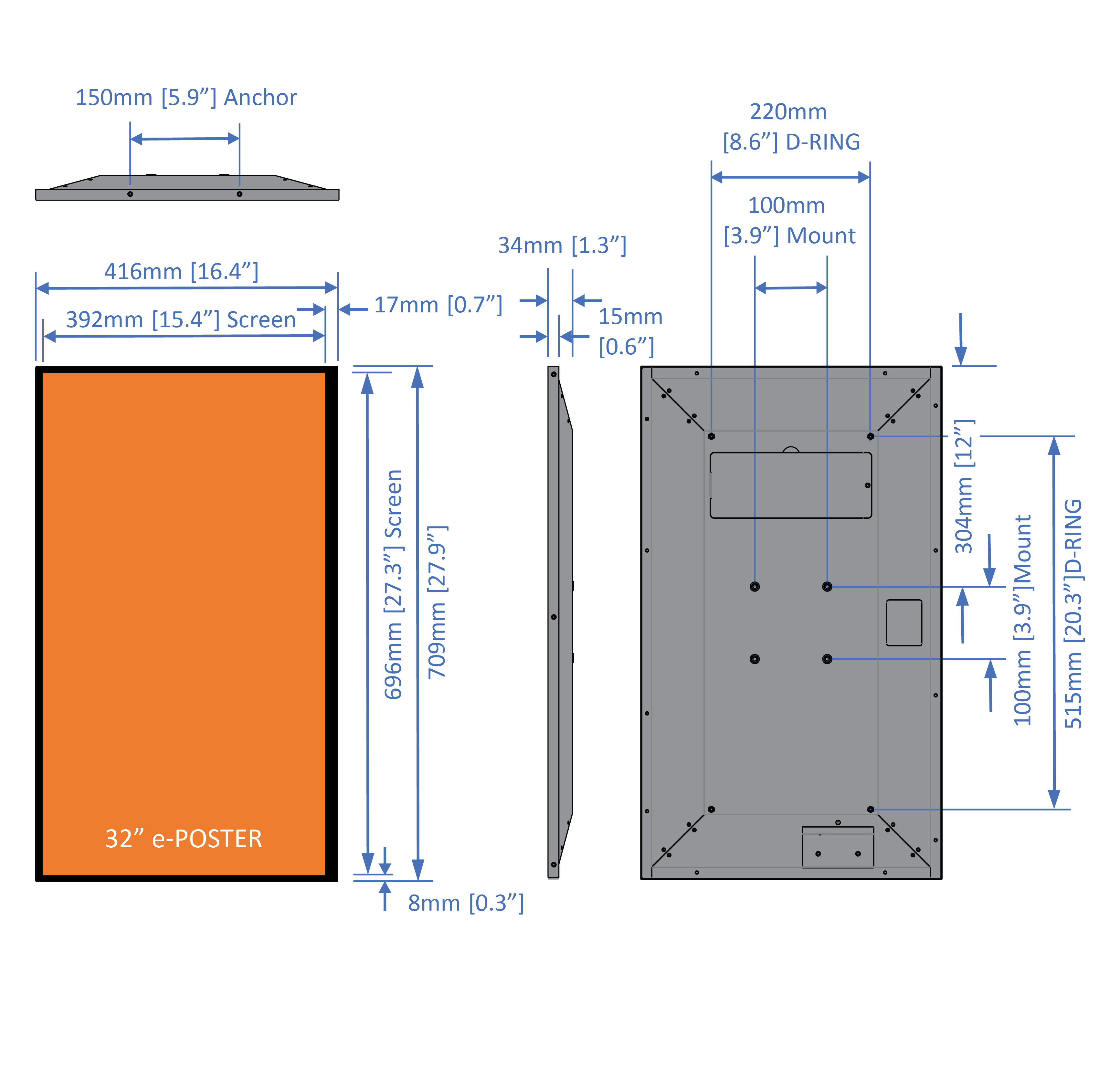 Wall-mounted 32" landscape or portrait 60K colour indoor ePoster digital display.