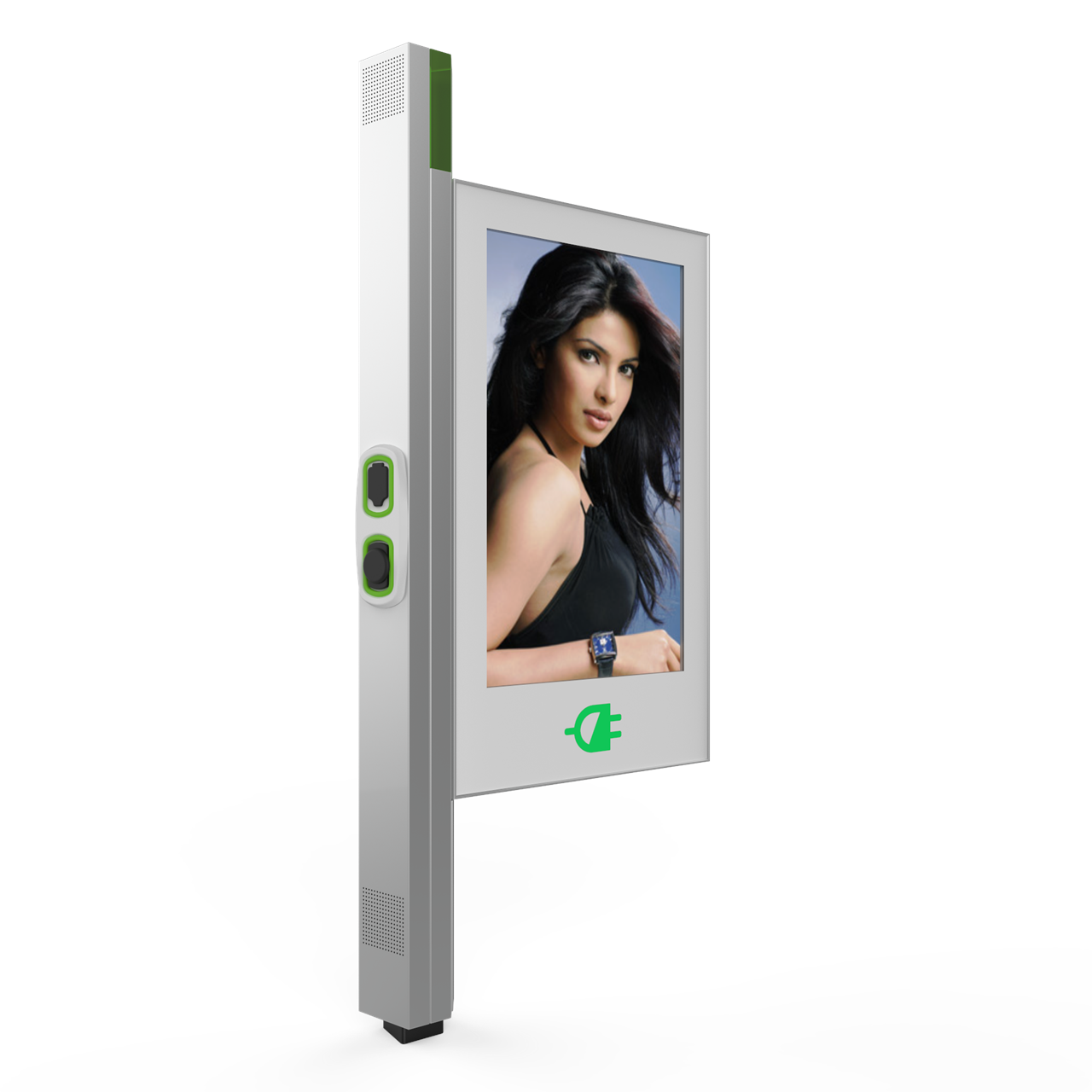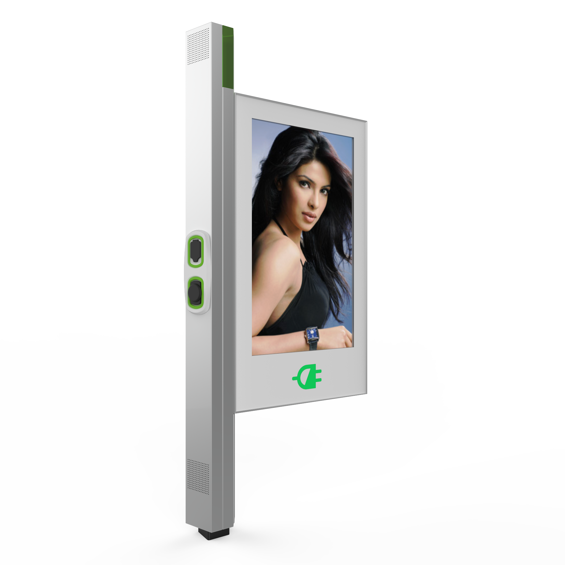 A free-standing pillar mounted double sided LED backlit poster display, complete with Electric Vehicle charging outlet.